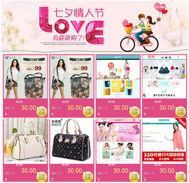 分享一份950宽的淘宝七夕素材,该淘宝促销模板主题为”七夕情人节有爱就购了“,本站之前发布了该模板的750版。两个模板分别在950、750自定义模块区,效果更漂亮哦。