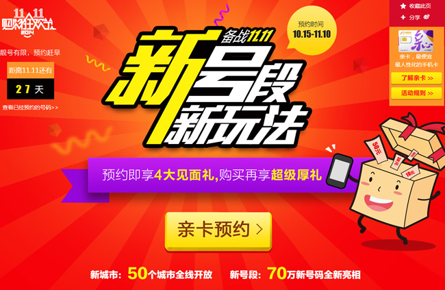 阿里通信宣布开放中国电信1700号段入网预约服务。阿里通信此次新增70万个号源,资费标准不变,将于今年11月11日零时起正式发售。此次阿里通信推出的电信1700号,基础资费与此前的联通1709号段一致:除次月开始的7元保底消费外,无服务费、无月租和漫游费,全国接听免费。新增电信号码均为CDMA2000网络制式的电信3G卡,覆盖全国50个重点城市。