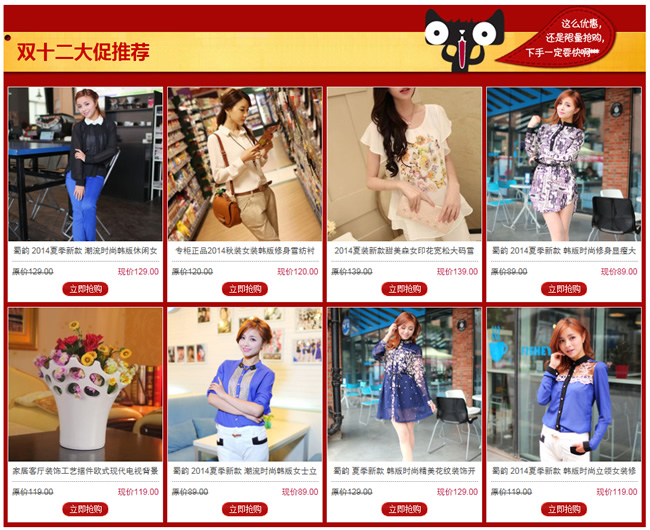 分享一份红色通用的淘宝双十二促销模板代码,模板宽度950,适合放在淘宝店铺首页或者列表页、搜索页面。