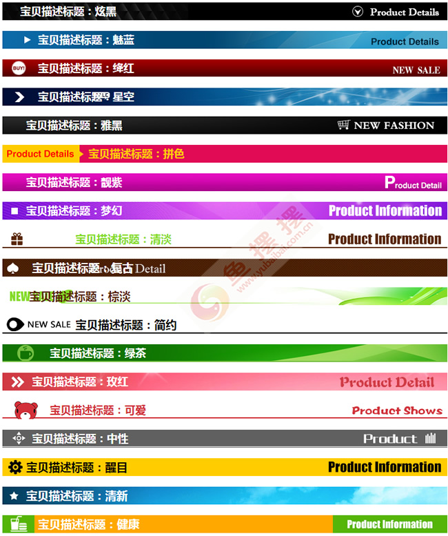 鱼摆摆今天专门整理了20个宝贝描述分隔标题代码,大家可以用于制作宝贝描述,介绍自己的产品时,作为分割标题使用。