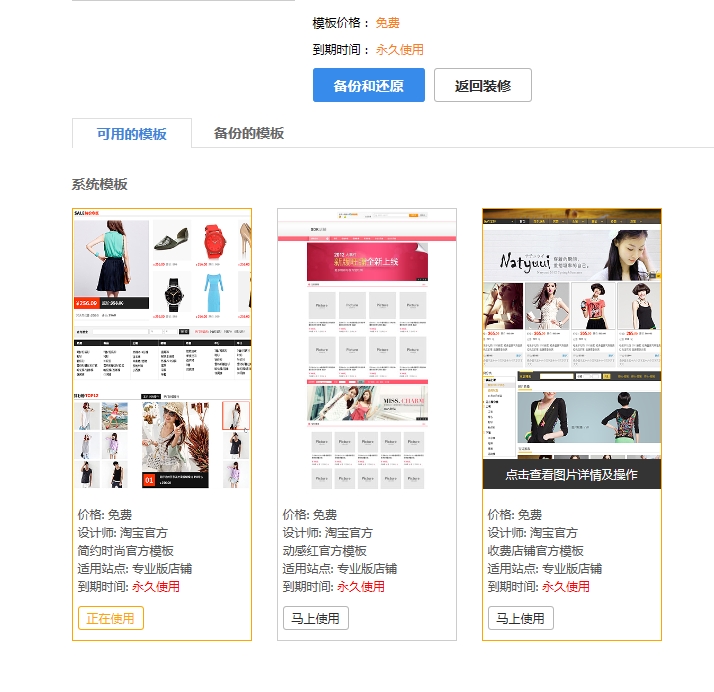 这三套模板分别是简约时尚官方模板、动感红官方模板、收费店铺官方模板。目前网上几乎所有的模板,都是基于简约时尚官方模板这套模板进行制作的。绝大部分的各种淘宝装修特效模板代码,比如什么全屏海报代码、轮播代码、卡盘代码等等,都是基于简约时尚官方模板制作。