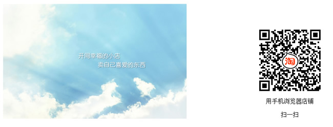 分享一份宽950的淘宝店铺装修,二维码图模块模板。加上这个模板后,可以提醒亲买家用手机进入你网店选购商品。模板中的文字:"开间幸福的小店,卖自己喜欢的东西",写的挺好,但愿能打动您的买家。