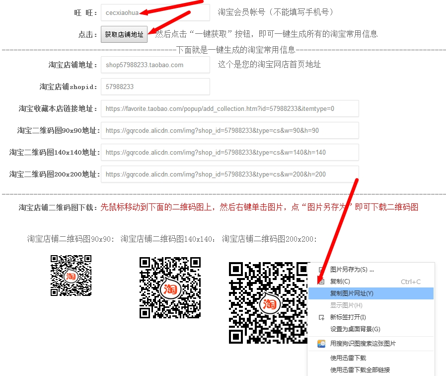 里面的二维码图,为淘宝网店手机淘宝二维码图,大家可以前往http://www.yubaibai.com.cn/tool/cy/,输入自己的淘宝旺旺号后,单击“一键获取”,然后鼠标移动到右下角第三张图上,单击鼠标右键,然后点“复制图片地址”,获取你自己网店200x200的二维码图。