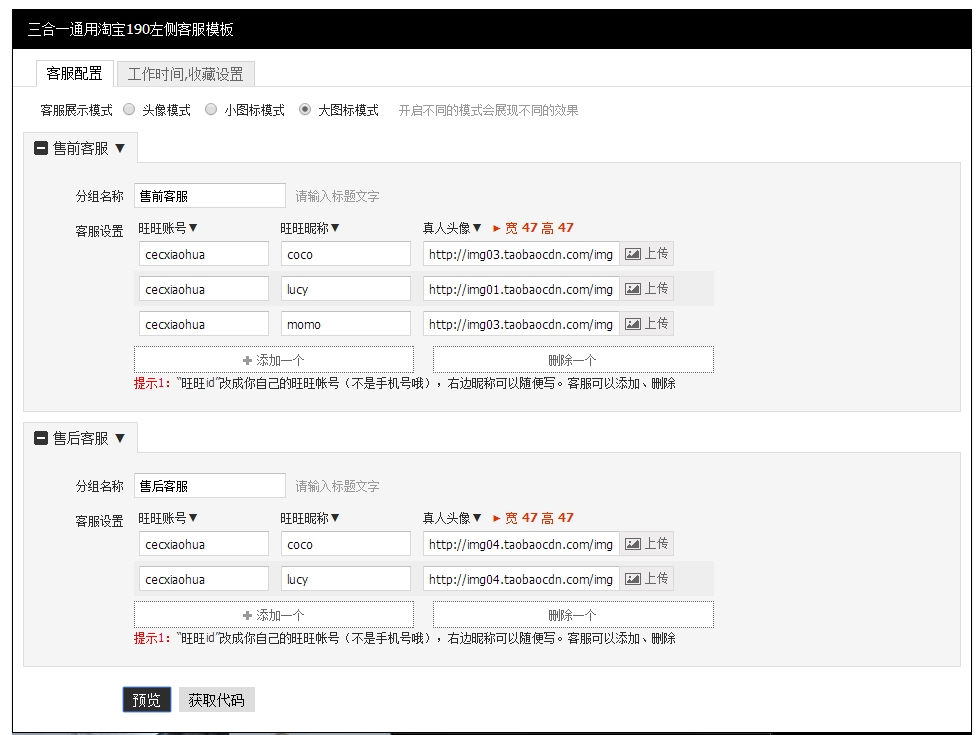 本小工具初衷为不懂代码的美工、设计师或者淘宝卖家而设计,只需要设置好旺旺帐号,客服昵称,工作时间,即可在线制作修改好淘宝装修模板,然后生成对应淘宝装修代码。
