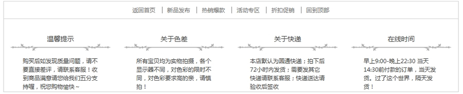 分享一个简洁、素净,且可在线制作的淘宝店铺底部模板代码在线生成器,生成的模板代码含温馨提示、色差说明、快递配送、在线时间提示内容,和返回首页、新品发布、热销爆款、活动专区、折扣促销、回到顶部快速链接功能。
