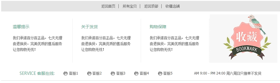 分享一个适合女装服饰、化妆品等网店使用的,漂亮的,可在线制作的淘宝店铺底部模板代码在线生成器,生成的模板代码含温馨提示、关于发货、购物保障、收藏本店、旺旺在线客服、工作时间,和返回首页、所有宝贝、返回顶部、收藏店铺快速链接功能。