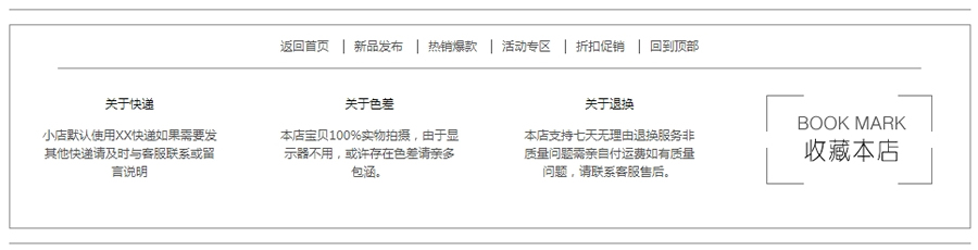 分享一个950宽,享一个简约线条风格,可以在线制作生成淘宝店铺底部模板代码的淘宝装修模板生成器,生成的淘宝模板收藏本店功能,关于快递、关于色差、关于退货提示说明文字,返回首页、新品发布等快速导航栏目