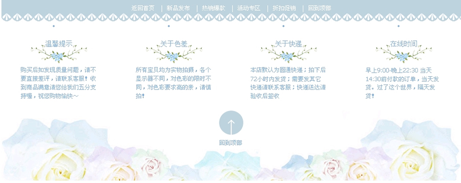 分享一个950宽,蓝色系,唯美漂亮,背景为玫瑰花的淘宝店铺装修模板在线制作工具:淘宝店铺底部模板代码在线生成器B649。