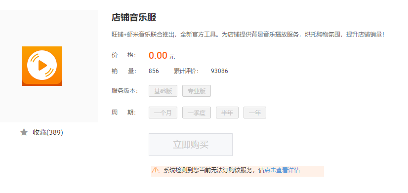 ?你好,看你的截图,多半你的店铺是淘宝店铺基础版。淘宝规定只有专业版或者智能版旺铺才能购买使用店铺音乐这个插件。啃爹的淘宝,为了要求大家购买付费版本的旺铺,挖了很多的坑。