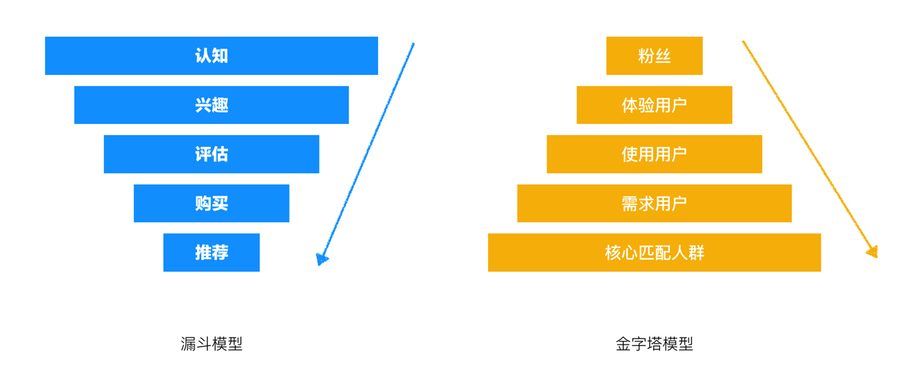 这两个模型的本质区别是,漏斗模型是递减,而金字塔模型是递增;漏斗模型先培养市场认知,金字塔模型先培养种子群体。这两个模型并没有孰优孰劣之说,它们只是适用于不同的产品而已。矿泉水、餐巾纸这类标准品,因为市场竞争充分,很难做出区隔,必须去大量触达用户,培养产品在用户心目中的印象,让用户在做选择时能够想到自己。但是像餐饮(比如火锅)、教育这类服务类产品,就很难用漏斗模型(并不是不能,而是很难)。原因是服务本身很难做标准化。用户即使了解了这个品牌,也还是要去体验才能做决策,而体验本身就是服务的一个缩影,此时做得好,彼时未必佳;此人做得好,那人未必佳。所以对服务业用漏斗模型营销的不确定性太高,转化率不能保证,ROI不能被准确预测。服务类产品适合金字塔模型,用低投入做营销,高投入做服务的标准化和质量。