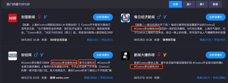 从参与者提及话题以及用户相关关键词来看,茅台以及爱马仕反而Costco用户提及最多的两个品牌。#茅台被抢光#、#爱马仕被抢光#频频成为Costco相关头部热门内容的重点。