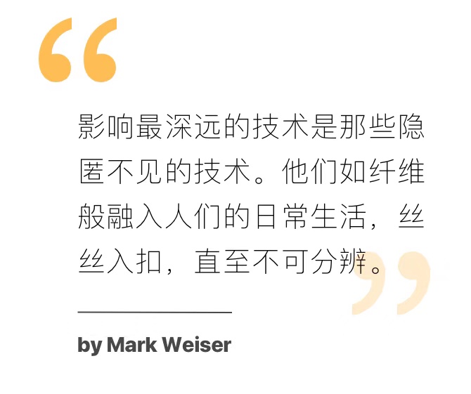 美国的计算机科学家Mark Weiser早在1995年就提出技术应该以安静、不引人注目的方式,作用于用户的外围注意力,来赋能用户。
