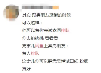 那些懂得循环经济的女孩,已经开始思考把这条排队的产业链轮动起来:女朋友试衣服的时候,男朋友负责排队,然后再把男友挂上闲鱼替人排队,此刻女孩可以去肆意地试口红和粉底。