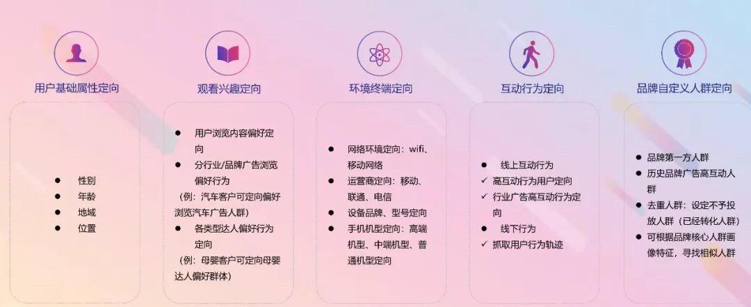 抖音可通过用户属性、观看兴趣、环境终端、互动行为描绘用户画像,针对性生成人群策略,大家可通过下列图片,查看详情。