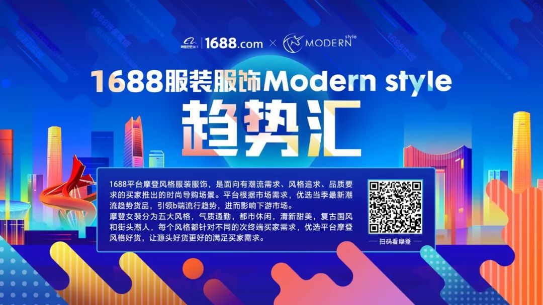 本届"织交会"联合阿里巴巴1688,首次尝试采用线上线下一体化展会模式,展示摩登趋势服装流通的数字化。双方以"大朗毛织"特色源头产业带为契合点,通过线下"1688服装Modern趋势汇"展位加上"1688产业带云展"线上数字化营销互动,共同打爆东莞(大朗)特色源头产地一手好货,形成产业带品牌,进一步推动大朗毛织向智造产业、时尚产业和文化产业转型升级。1688 Modern style业务,是面向有潮流品质需求的买家推出的时尚导购场景,紧贴市场热点趋势,挖掘流行趋势货品 。通过五大潮流风格(气质通勤、都市休闲、清新甜美、复古国风、街头潮人)构建丰富多元化的女装货源市场,让趋势源头厂货更精准的满足买家需求。