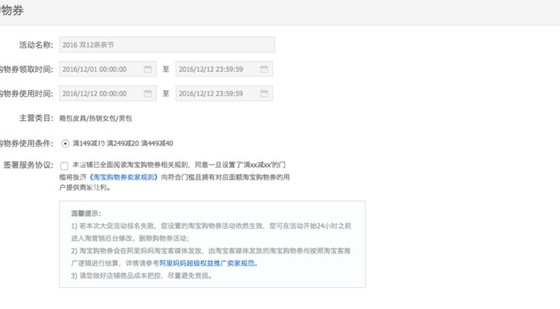 删除逻辑:报名大促会场的卖家审核通过,且淘宝购物券作为准入资质的,则不允许删除。并且12月11日0点禁止删除