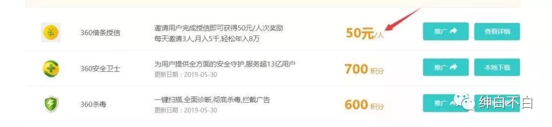 图片可以看到,它的联盟里推荐一个人注册360借条,都不需要推荐的人从里边借钱就可以收入50元。