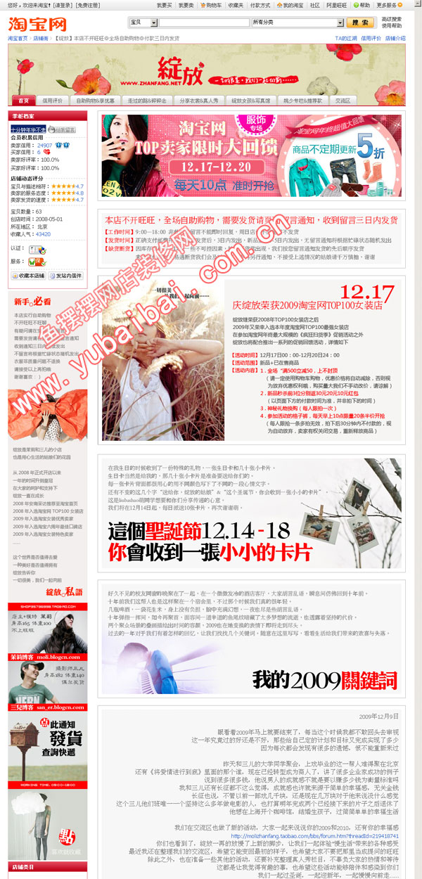 川普咖啡点评:无意间发现这个特别、温馨、浪漫般的淘宝店铺。掌柜的店主兼模特与其摄影师老公“三儿”共同经营着这个淘宝店铺,他们和长时间不离电脑的淘宝卖家不一样的是,一边旅游一边上新品。店铺不开启旺旺,全部自助购物。他们外出旅游所拍大部分照片中涉及的衣服都会放在店里销售。开店一年多已经是两皇冠了,他们不但成功入围2008年淘宝女装TOP100,还被选为第一期的淘宝女装优秀卖家,而且一直保持着100%的好评率。