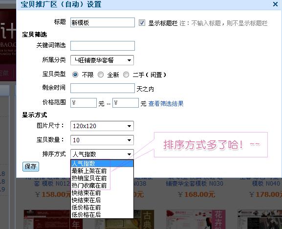 8、 宝贝推广区(自动)模块新增了按收藏量、销售量、最新上架(第一次发布时间)3种方式排序