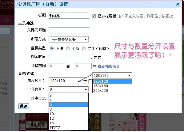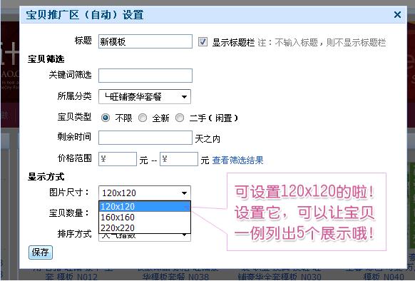 7、 宝贝推广模块中的设置将图片尺寸和显示宝贝个数分开。可以单独设置图片的尺寸和显示宝贝的个数。